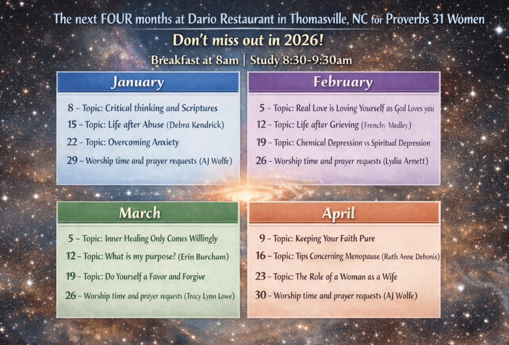 Meet us at Dairi-O in Thomasville, NC starting January 8, 2026 at 8 am for breakfast and Bible study. Join Apostle Liz as she helps women get back on track for the Kingdom of God. We will talk about things relevant to the modern-day woman and how we can be empowered for the work we have in our hands. Faithful, Family and Fearless! We are Proverbs 31 Women ♥